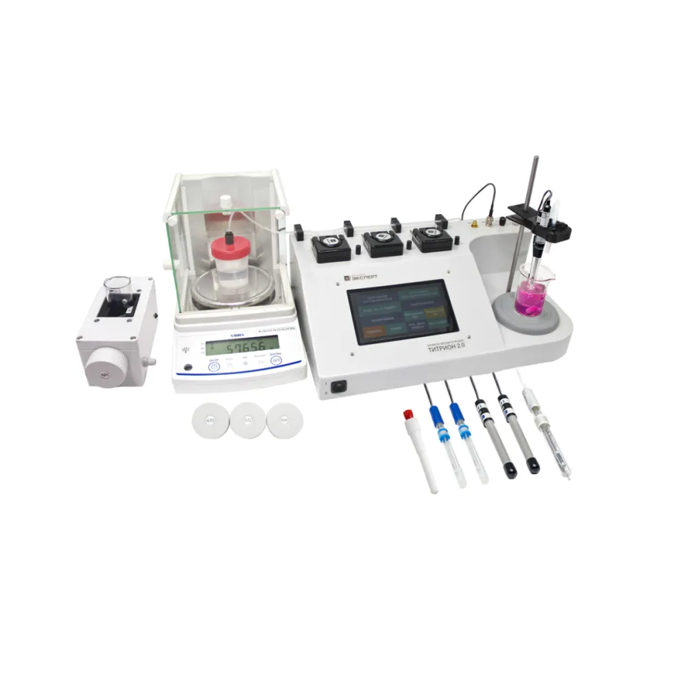 Принципиальное отличие и преимущество автоматического титратора Титрион 2.0 - использование в приборе нового принципа объемновесового дозирования. Прибор непрерывно взвешивает исходный раствор, применяемый для титрования. Точность взвешивания в 1 мг обеспечивает точность дозирования 1 мкл, что превосходит точность лучших импортных бюреток, а главное – является объективным , наглядным и прозрачным показателем. Конструкция титратора Титрион 2.0 исключает слабое место всех автоматических дозирующих устройств: неконтролируемые нарушения точности дозирования за счет сбоев в механизмах поршневых бюреток.Для быстрой смены титранта или добавления вспомогательных растворов в титраторе установлено сразу три перистальтических насоса и три независимых подающих магистрали. С их помощью можно работать с одним, двумя или тремя растворами, находящимися на платформе весов: • с тремя разными титрантами или с титрантом, взятом в трех разных концентрациях; • со стандартным раствором и титрантом для проведения обратного титрования; • с двумя вспомогательными растворами и одним титрантом и т.д. ТИТРИОН 2.0 является бюджетным аналогом самых дорогих модификаций импортных титраторов, укомплектованных тремя цифровыми поршневыми бюретками!Титратор ТИТРИОН 2.0 снабжен удобным программным обеспечением, большим сенсорным экраном и имеет внушительный объем внутренней памяти. Управление титратором, просмотр результатов, а также их обработка и хранение выполняются без обязательного подключения к компьютеру. При необходимости титратор, можно подключиться к ПК с помощью проводных (Ethernet, RS232, USB) или беспроводных (Bluetooth, Wi-Fi) интерфейсов связи. В память прибора также можно загрузить методики или скопировать архив результатов с помощью обычного флэш-носителя (USB Flash Drive).Титрион 2.0 поддерживает все необходимые в общелабораторной практике режимы титрования: • потенциометрическое (окислительно-восстановительное, кислотноосновное, осадительное); • фотометрическое (комплексонометрическое и др.); • кондуктометрическое; • амперометрическое. Основной режим работы прибора – автоматическое титрование по заранее составленному алгоритму. Возможны следующие режимы работы титратора «Титрион 2.0: • полуавтоматическое титрование с «ручным» управлением подачи титранта; • статирование с поддержанием заданного уровнярН (рХ), Еh, УЭП или оптической плотности.